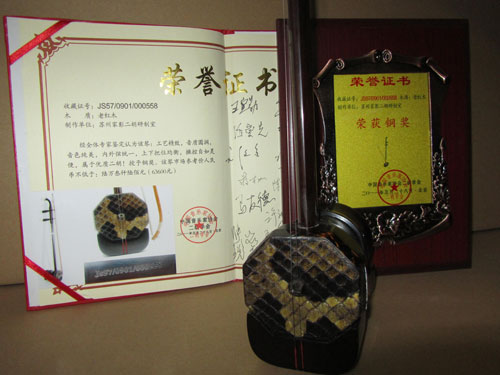 二胡制作大師丁家彭先生1949年出生樂器世家,17歲隨其祖父學琴藝,并深得精髓,其聰穎好學,悉心鉆研與 探求二胡制作,博得同行的欽佩贊許,更得了許多知名演奏家的稱贊,充分認識到二胡制作每個環節,都對二胡制作都有影響力,因此對二胡的選材,選料,蟒皮都十分嚴格,二胡整體穩定性良好,環境干擾影響極小。